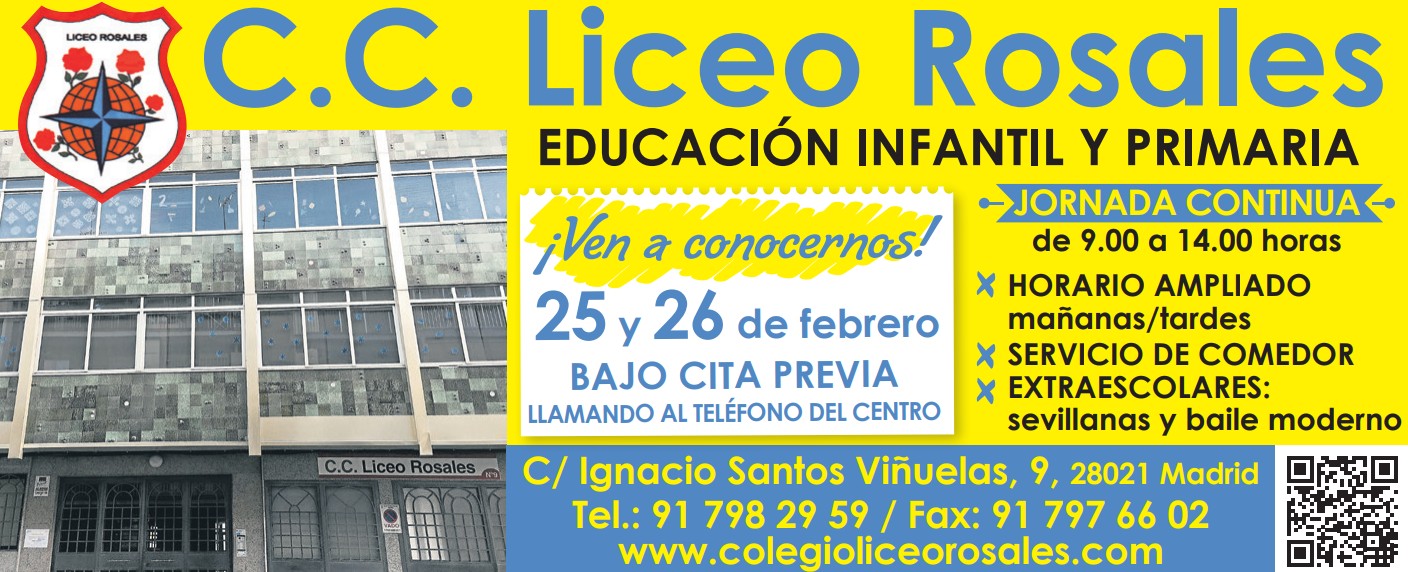 Bienvenidos al LICEO ROSALES, un centro de educación infantil ubicado en el corazón de Madrid, en la calle Ignacio Santos Viñuelas. Nuestro centro ofrece una educación de calidad en un entorno acogedor y estimulante. Para más información, visite nuestro sitio web en http://www.colegioliceorosales.com